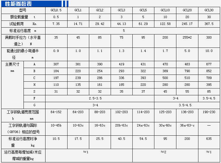 GCL型0.5-30噸手鏈單軌小車參數(shù):