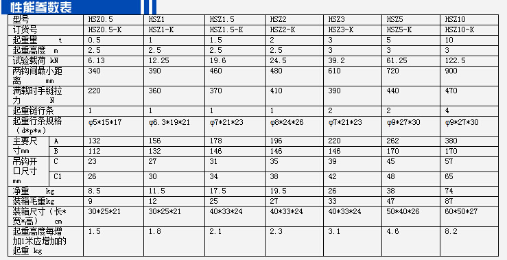 | HSZ-K類0.5-10噸手拉葫蘆參數(shù): | |