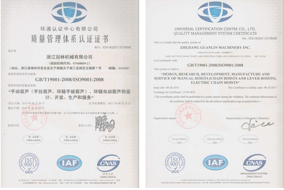 浙江冠林機(jī)械有限公司獲得輕小型起重運(yùn)輸設(shè)備——手動(dòng)葫蘆9000認(rèn)證